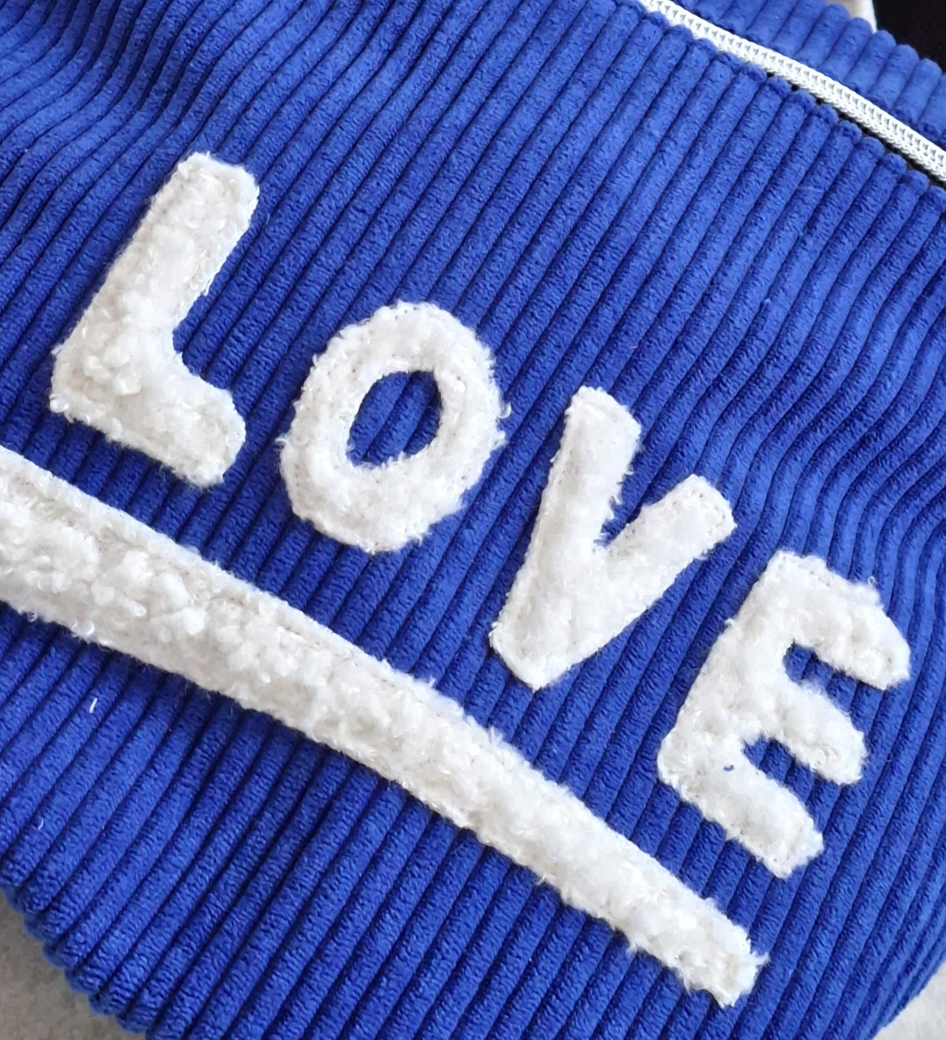 Réalisé en velours côtelé bleu électrique, il se distingue par son inscription LOVE sur le devant, confectionnée en tissu bouclette blanc, pour un contraste moderne et plein de caractère. Son intérieur en coton blanc à motifs bleus assortis apporte une finition soignée et élégante jusque dans les moindres détails.